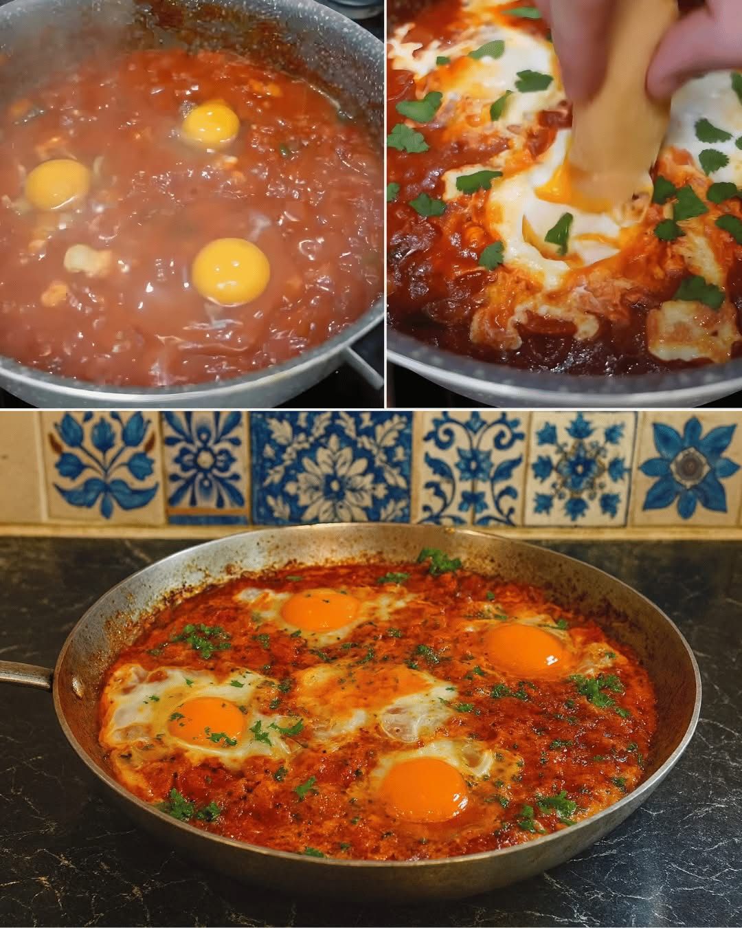 La chakchouka est bien plus qu’une simple poêlée d’œufs à la tomate. C’est un plat convivial, souvent partagé directement dans la poêle, accompagné de pain frais pour savourer chaque bouchée. Sa couleur rouge intense, ses œufs bien visibles et ses herbes fraîches en font un plat aussi beau que délicieux.