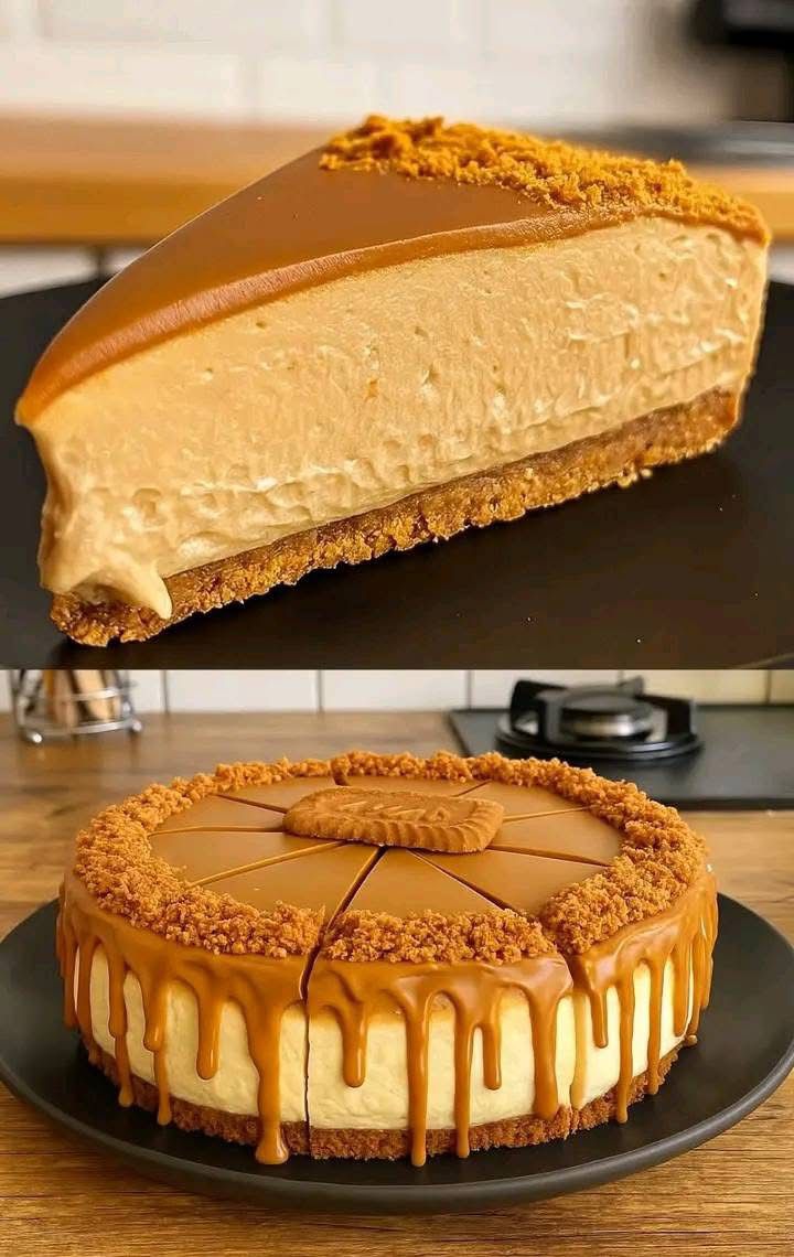 Le dessus du gâteau, recouvert d’un nappage parfaitement lisse, couleur caramel doré, évoque immédiatement la pâte de spéculoos fondante. À l’intérieur, une mousse crémeuse et aérienne repose sur une base croquante de biscuits écrasés. Le contraste entre la texture fondante de la crème et le croustillant du fond de tarte rend ce dessert absolument irrésistible. Dans cet article, nous allons découvrir les secrets de ce cheesecake spectaculaire, les ingrédients nécessaires, la préparation étape par étape ainsi que des astuces de chef pour réussir un résultat aussi parfait que celui présenté sur la photo.